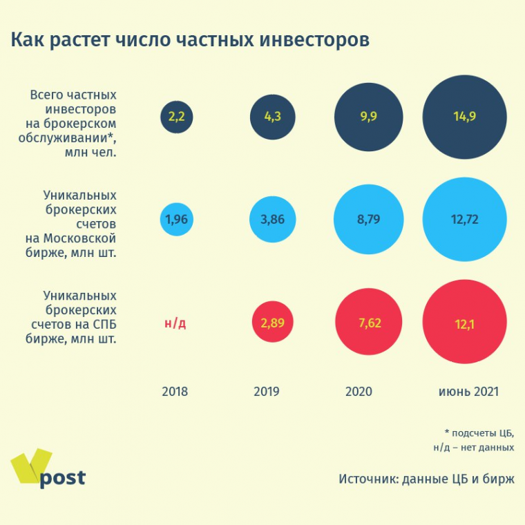 Российский фондовый рынок переживает бум розничных инвестиций. За последние несколько лет количество частных инвесторов выросло в разы благодаря брокерским приложениям, сделавшим инвестиции доступнее, индивидуальным инвестиционным счетам (ИИС), позволяющим получить налоговые льготы, быстрому росту фондовых рынков, снижению банковских ставок и пр. Совокупная стоимость активов частных инвесторов на брокерских счетах по итогам II квартала 2021 г. составила 7,2 трлн руб., писал Центральный банк.
