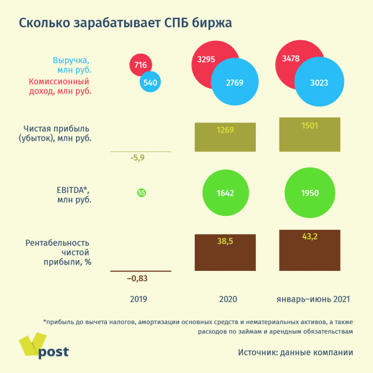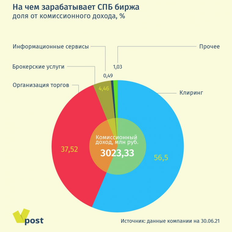 Большую часть дохода — 87% на конец июня — компании приносят комиссии: за проведение сделок, клиринг (расчеты по сделкам), листинг, брокерские услуги (принадлежащий бирже «СПБ банк» может выступать брокером для финансовых посредников без брокерской лицензии), информационные сервисы и пр. Чем больше обороты торгов и выше котировки, тем больше комиссионный доход.