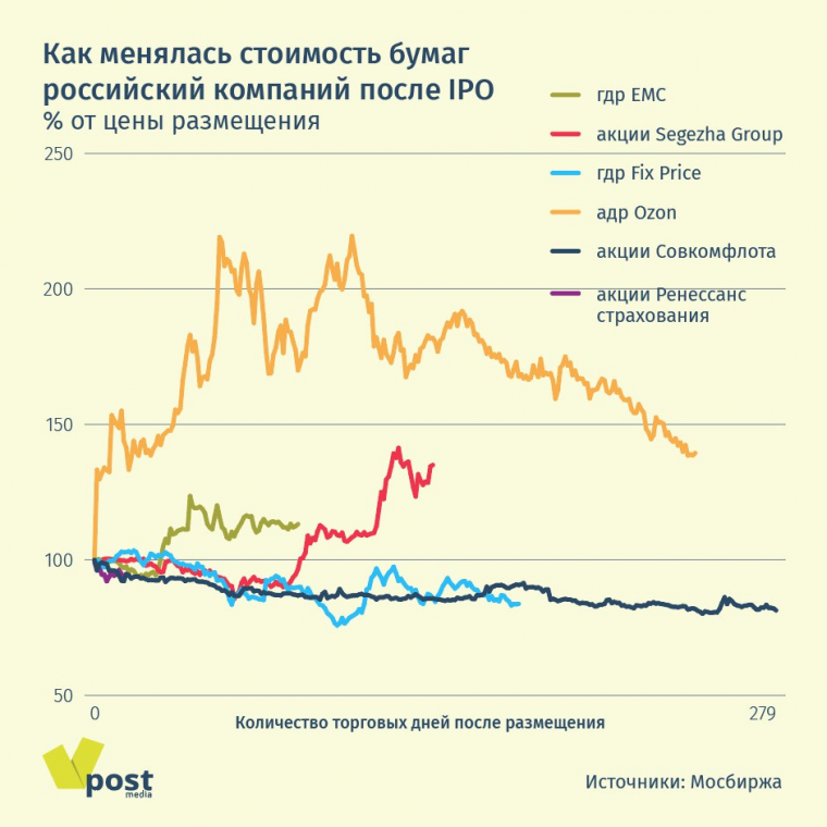 Других экспертов беспокоят результаты последних IPO российских компаний. Бумаги тех эмитентов, что все же разместились, торгуются ниже цены размещения, а Mercury Retail Group (магазины «Красное& Белое» и «Бристоль») и «Делимобиль» в последний момент отложили размещение. Не самый благоприятный фон перед IPO биржи может несколько ограничить интерес инвесторов к сделке, допускает Додонов. Динамика недавних IPO, как минимум, настораживает, согласен Веревкин: