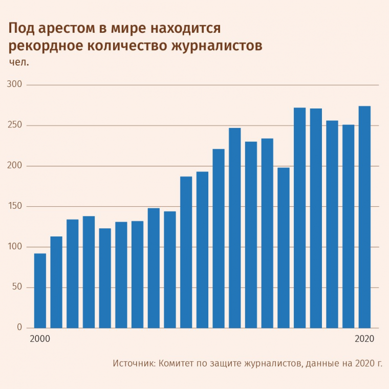 Обстоят они не очень. Средства массовой информации в мире испытывают беспрецедентное давление. В 2020 г. под арестом находилось больше журналистов, чем когда-либо ранее (247, из них 10 — в России), по данным международного Комитета по защите журналистов; а число убитых сотрудников СМИ выросло на треть до 66 по сравнению с 2019 г.