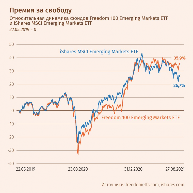 Если в 2019–2020 гг. динамика фонда Freedom 100 Emerging Markets ETF мало отличалась от iShares MSCI Emerging Markets ETF (крупнейший биржевой фонд, основанный на индексе MSCI Emerging Markets, под управлением BlackRock), то сейчас «свободный» фонд впереди на 9,2 процентного пункта. «Наш лучший результат в этом году объясняется исключением Китая, чья доля в большинстве индексов и фондов развивающихся рынков составляет 35-40%. Его рынок акций в этом году рухнул именно по той причине, по которой мы исключаем Китай, — из-за экстремального вмешательства властей в работу частных рынков, что подрывает экономическую свободу», — пояснила Толле, которую журнал Wealth Management Magazine в 2020 г. включил в топ-10 наиболее многообещающих управляющих за инновации в сфере инвестиций на основе показателей свободы.