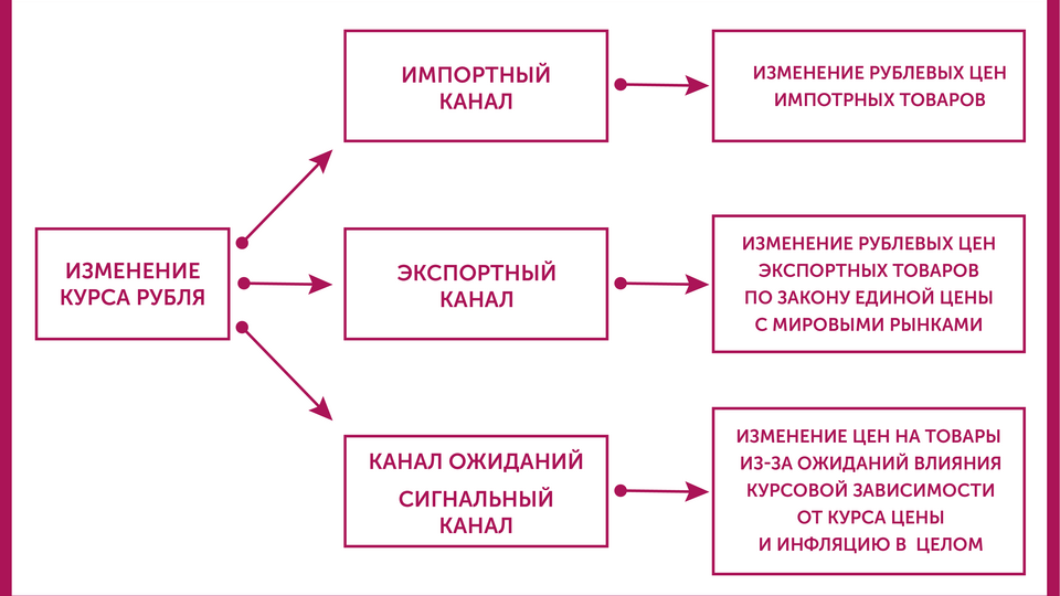 Курс валюты – один из основных каналов, через которые денежно-кредитная политика влияет на инфляцию (так называемый трансмиссионный механизм). В первую очередь изменение курса транслируется в изменение цен через импорт (опосредованно и через экспорт). Ослабление национальной валюты увеличивает стоимость импортных товаров, а также местных товаров и услуг, при производстве которых используются иностранные сырье или комплектующие. Кроме того, влияние курса может приводить к подорожанию товаров и услуг в целом, но чем дальше по цепочке ценообразования, тем оно слабее: сильнее всего изменение курса транслируется непосредственно в импортные цены, слабее – в цены производителей и еще меньше – в потребительскую корзину. По оценке ЕЦБ, например, перенос курса в индекс потребительских цен в еврозоне составлял всего одну десятую от того, как курс переносился в импортные цены.